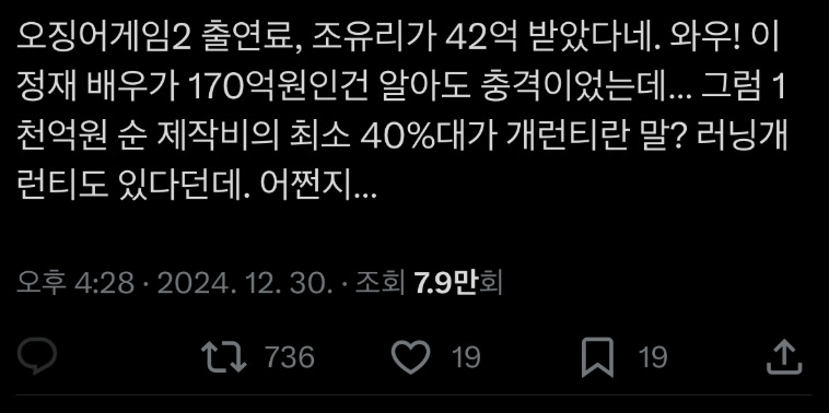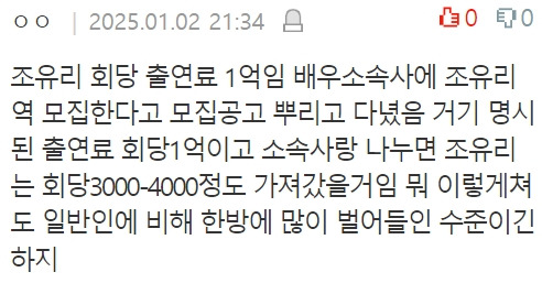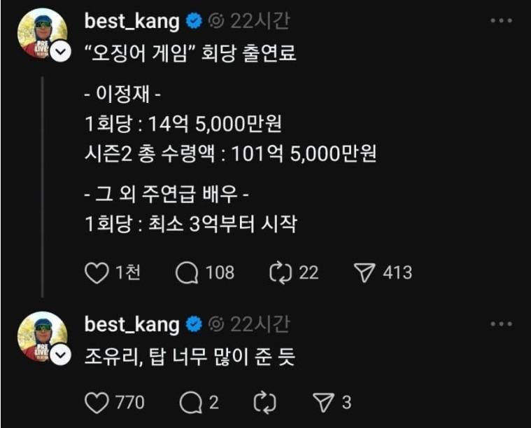 조유리가 오징어게임2에 출연 후 실제로 받은 금액 1월 3, 2025 작성자: comupan 댓글 남기기 응답 취소댓글이름 이메일 웹사이트 다음 번 댓글 작성을 위해 이 브라우저에 이름, 이메일, 그리고 웹사이트를 저장합니다. Δ