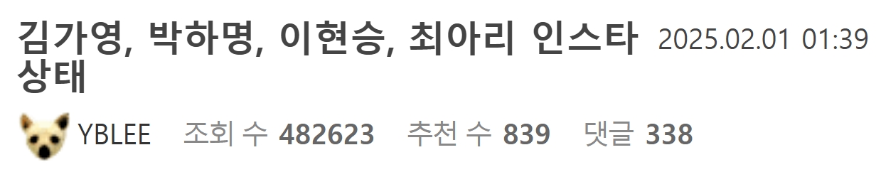 MBC가 계속 논란인물인 김가영만 내보내는 이유 ㄷㄷ 2월 2, 2025 작성자: comupan 댓글 남기기 응답 취소댓글이름 이메일 웹사이트 다음 번 댓글 작성을 위해 이 브라우저에 이름, 이메일, 그리고 웹사이트를 저장합니다. Δ