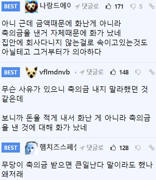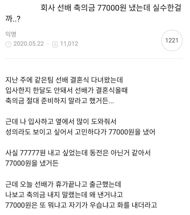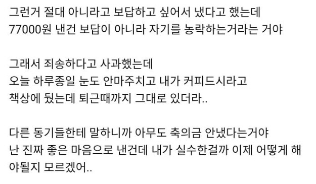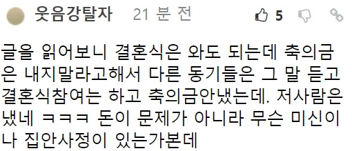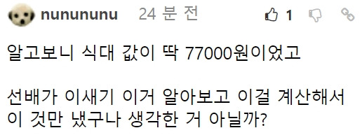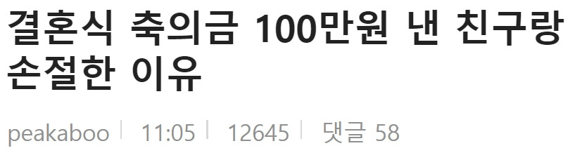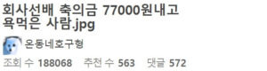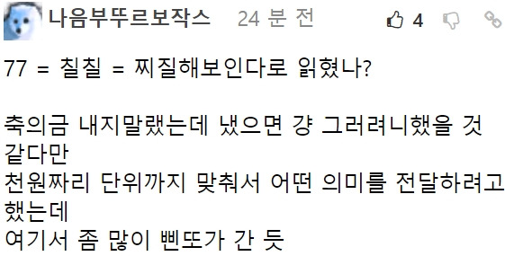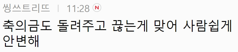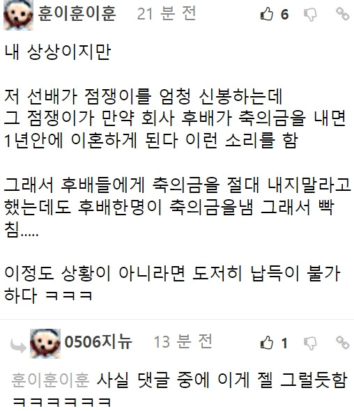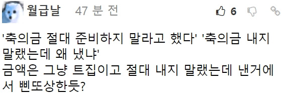 회사선배 축의금 77000원 내고 욕 먹은 사람 5월 19, 2025 작성자: comupan 댓글 남기기 응답 취소댓글이름 이메일 웹사이트 다음 번 댓글 작성을 위해 이 브라우저에 이름, 이메일, 그리고 웹사이트를 저장합니다. Δ