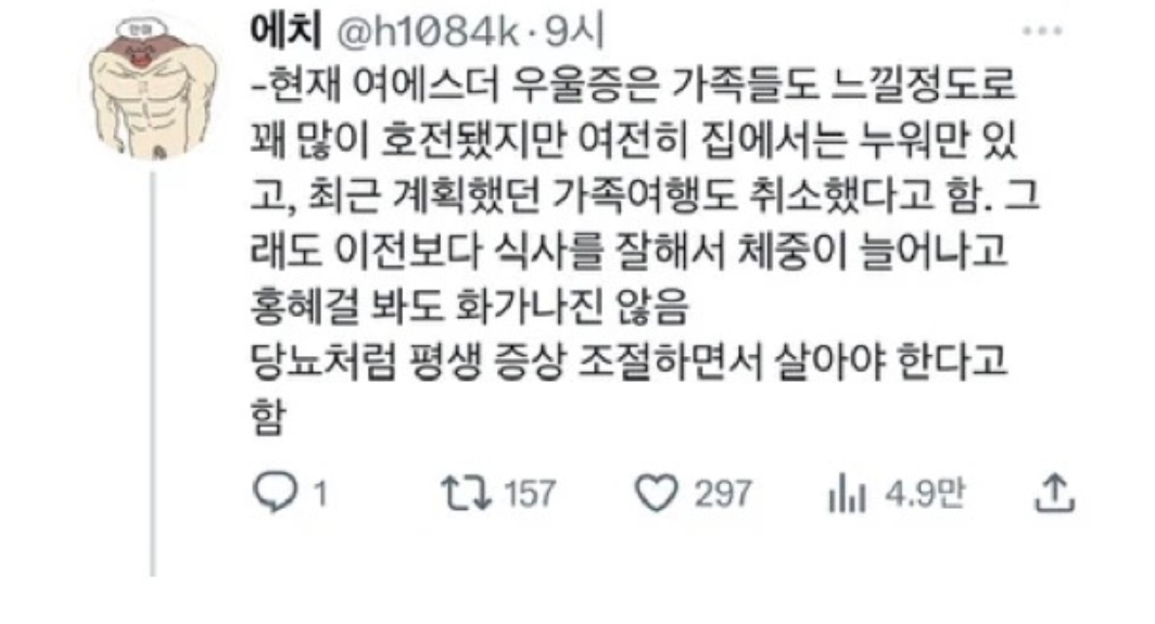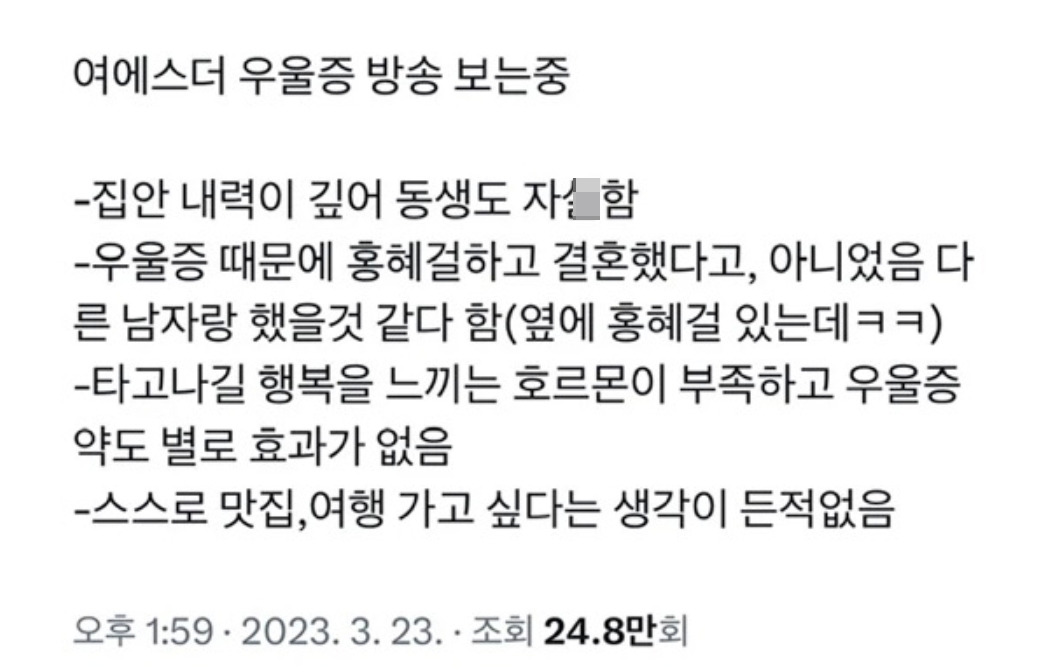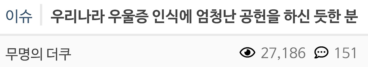 우리나라 우울증 인식에 엄청난 큰 공헌을 하신 분 5월 23, 2025 작성자: comupan 댓글 남기기 응답 취소댓글이름 이메일 웹사이트 다음 번 댓글 작성을 위해 이 브라우저에 이름, 이메일, 그리고 웹사이트를 저장합니다. Δ