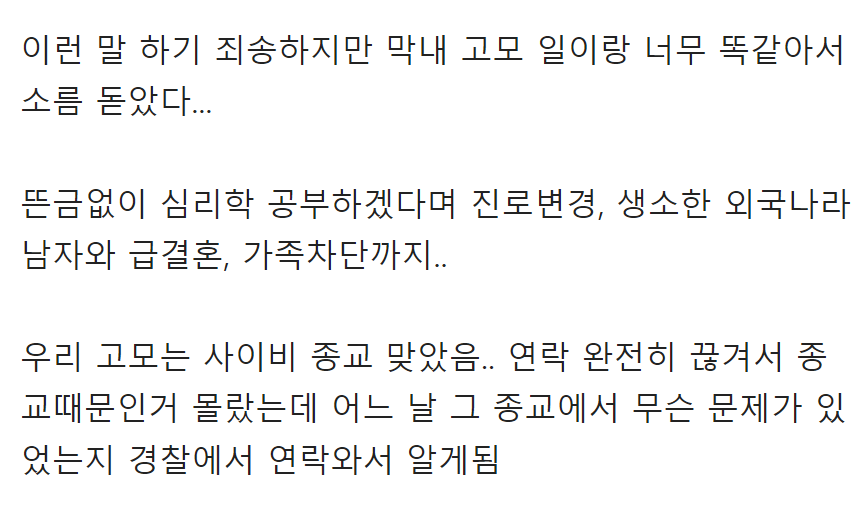 소름 끼친다고 난리난 연 끊고 사라진 누나 물어보살 사연 5월 27, 2025 작성자: comupan 댓글 남기기 응답 취소댓글이름 이메일 웹사이트 다음 번 댓글 작성을 위해 이 브라우저에 이름, 이메일, 그리고 웹사이트를 저장합니다. Δ