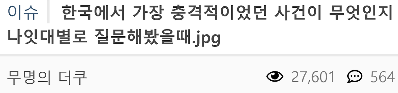 한국에서 가장 충격적이었던 사건에 대해 연령별로 질문했을 때에 대한 대답 5월 27, 2025 작성자: comupan 댓글 남기기 응답 취소댓글이름 이메일 웹사이트 다음 번 댓글 작성을 위해 이 브라우저에 이름, 이메일, 그리고 웹사이트를 저장합니다. Δ