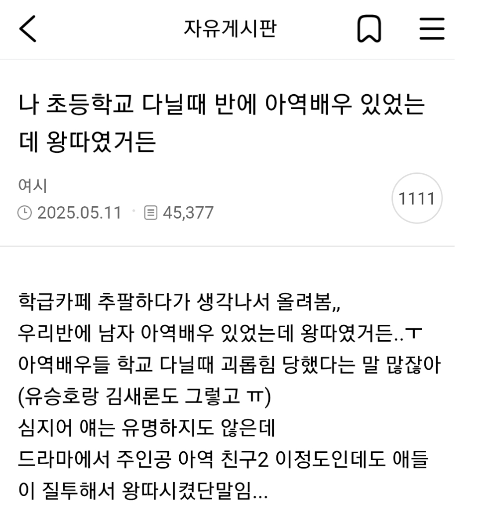 나 초등학교 다닐때 반에 아역배우 있었는데 ㅇㄸ였거든 6월 3, 2025 작성자: comupan 댓글 남기기 응답 취소댓글이름 이메일 웹사이트 다음 번 댓글 작성을 위해 이 브라우저에 이름, 이메일, 그리고 웹사이트를 저장합니다. Δ